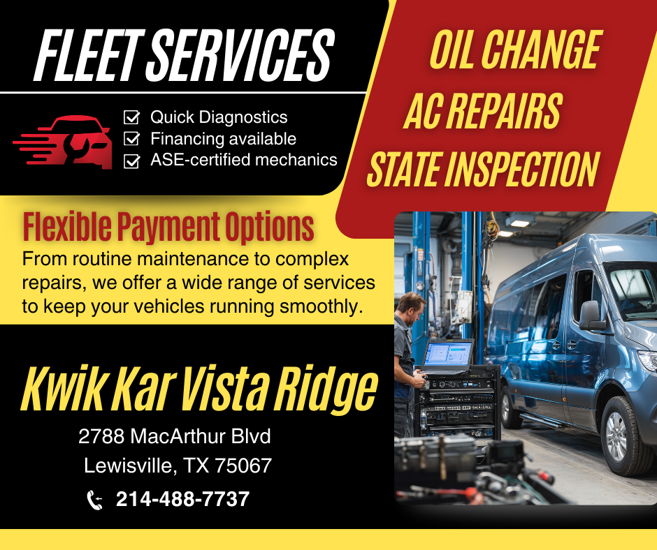 At Kwik Kar Vista Ridge, we specialize in providing comprehensive fleet services tailored to meet the unique needs of businesses in Lewisville, Coppell, Flower Mound, Highland Village, and Carrollton, TX. Our experienced team ensures that your fleet remains in optimal condition, minimizing downtime and maximizing productivity. From routine maintenance to complex repairs, we offer a wide range of services to keep your vehicles running smoothly.